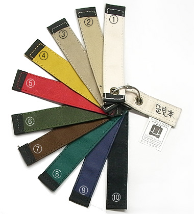一、生成 : natural white 二、駱駝 : beige 三、枯草 : grege 四、芥子 : yellow 五、赤 : red 六、菊水 : olive drab 七、茶 : brown 八、緑 : green 九、紺 : deep blue 十、黒 : black |